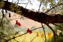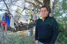 Near the massacre site, beside the DUP monument, is an old Russian olive tree whose low branches are draped with dream-catchers, flags, beads, toys, tobacco, coins and dozens of others offerings that give a silent testament to the power of the place.