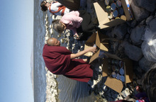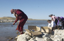 Sitting cross-legged on a boulder along the shore, Getse quietly chanted and chuckled occasionally as the others, including a lama from Colorado and Getse's translator, a monk, spread the eggs over the water.