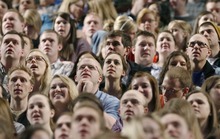 Inside the near-packed arena, however, students gave Rice a warm reception and sang the hymn "Rejoice, the Lord Is King" to open the event.