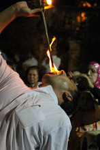 There were a snake handler, a scorpion eater and a man who drove knives into his skull with a hammer. One subject placed a piece of burning coal in his mouth, which glowed orange like a jack-o'-lantern as he marched about the courtyard. A teenage boy stood stoically as an older accomplice drove several spikes through his cheeks and neck. Another man accepted a sword through his breast.
