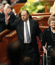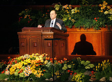 In the day's first speech, Monson highlighted the church's humanitarian efforts, especially in the wake of Japan's devastating earthquake.