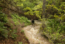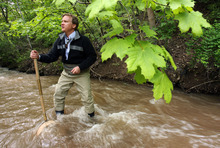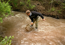 At Miller Park, a scenic forest near 1500 East with Red Butte Creek running through its heart, Holcomb steps carefully into the stream it's running high and stirs up the bottom with a net.
