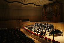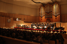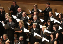 The 38-voice choir and 36-piece orchestra opened the evening with Daniel Pinkham's engaging Christmas Cantata. The three-movement cantata is the composer's best-known work, but not as well-known as it ought to be. Bradford and his ensemble captured its bold, vivid colors with vibrant clarity.