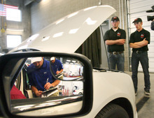 Jordan Kearns and Chandler Adkins correctly identified and fixed intentionally installed defects in a vehicle during the Ford/AAA Student Auto Skills Competition at Salt Lake Community College's Miller Campus in Sandy.