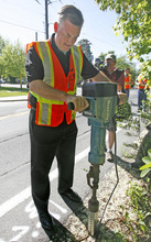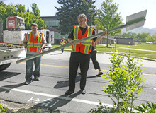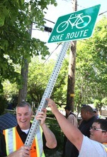 The promotion coming during National Bike Month began in Millcreek, where Mayor Peter Corroon teamed up with his "bolt man," county sign and striping specialist Orrey Nell, to install a sign showing that Evergreen Avenue (3450 South) was an official bicycle route.