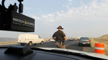 Calkins catches up, flips on his flashing lights and signals the car to pull off to the right. Instead, it pulls to the left, where little shoulder exists, and stops. That blocks the express lane. Calkins uses a loudspeaker to tell the driver to move to the right. The car sits still. Calkins runs up to the driver and tells him he will help with his flashing lights to move him off to the right so they do not block the lane.