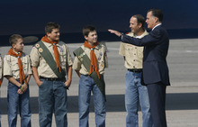 A handful of Scouts in uniform greeted Romney as he got off his plane on Tuesday for a fundraiser in Salt Lake City. The scene was similar two weeks ago, when Republican vice presidential candidate Paul Ryan arrived at the Provo airport.
