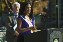Lee, who now holds the Miss Legacy beauty contest title and is a student at Utah Valley University, spoke as part of a ceremony in Sandy marking domestic violence awareness month. Officials released 359 purple balloons at city hall Tuesday to symbolize the victims of physical domestic violence in Sandy last year, and also set 610 blue pinwheels in the ground, each symbolizing a child who witnessed that violence.