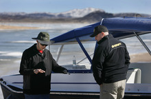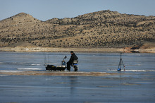 Manila • Whips of wind cut through Lucerne Valley early Saturday as ice fisherman Mike Musselman inched slowly ontothe frozen lake. Beneath his feet, the slippery surface of Flaming Gorge Reservoir creaked and groaned. Cracks in the ice glistened under pools of fresh water.