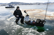 That's good news for ice fishermen like Clark Sabey, who sat crouched over a small hole in the ice hoping the fish would bite.