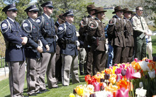 Just before the service ended, a solitary uniformed officer played "Amazing Grace" on the bagpipes. When he finished, officers from agencies all over Utah stood straight-backed at attention as the Utah Highway Patrol Honor Guard fired three shots in salute. When they finished, the officers  many of whom sported black bands over their badges  saluted as a bugler played taps.