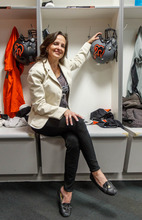 Now she paces around the halls of EnergySolutions Arena, greeting passing employees in her strong Southeast Texan twang, inquiring about their day, a tall soda in her left hand. She sits in the Blaze locker room, equipment strung out from a recent practice and takes in the moment, staring at helmets and gloves in various lockers.