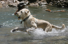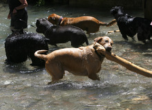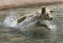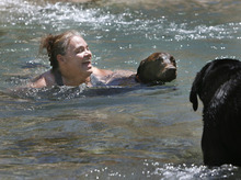 Cathy Brinton, of Midvale, laughed and tossed a tennis ball into the deeper water for her dogs. Hershey, the black lab, paddled toward it. But when the black lab Licky didn't follow, Brinton led the way, splashing into the cold water.