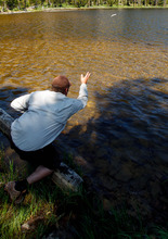 Black was having a hard time getting the newcomers to take the flies he was presenting, as the fish were likely a little rattled after hitching a ride to Echo Lake from the hatchery truck via oxygen-fed coolers strapped to off-highway vehicles.