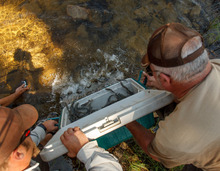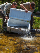 The first batch of 13,000 goldens were stocked at about 2 inches long in the summer of 2012 at three lakes in the Atwood Creek drainage. The goal was for 3,000 to be released this summer at Echo. Things went better than expected at Midway Hatchery over the past year and 4,800 fish, averaging 6 to 8 inches, were released after their rough ride on the Murdock Basin Road.
