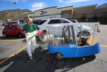 It now has a range of about 50 miles on level terrain at 30 mph, or 40 miles on hilly terrain. It carries only the driver, but has plenty of room for groceries or other cargo. It is enclosed, so he can use it during winter, yet the three-wheel vehicle is licensed in Utah as a motorcycle with a horn, lights, signals, padded seat and seat belt.