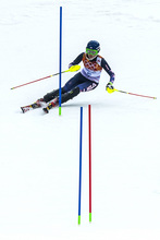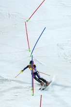 Fearing that she might ski off the course, she managed to redirect her left ski in the air, stop quickly, negotiate the slalom gate and finish a winning run Friday night. That's a veteran move, for a skier who will turn 19 in three weeks.