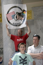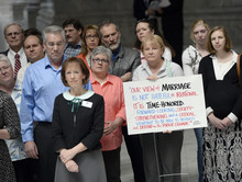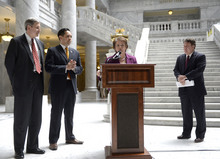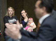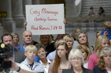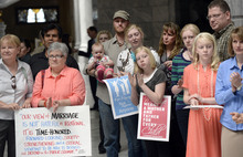 Mary Summerhays, representing the Utah Celebration of Marriage, held up a photograph of two gay men holding their newly adopted children and smiling alongside their birth mother.
