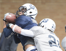 While Darell Garretson did get "sacked"  quarterbacks wear non-contact jerseys, so sacks are more subjective  several times, including twice by Kyler Fackrell, he did make the most of his completions with 221 yards through the air and two touchdowns. Brandon Swindall accounted for one of the scores, catching a contested ball in the back of the end zone for a 29-yard strike.