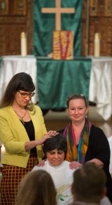 Kate Kelly, who was excommunicated from The Church of Jesus Christ of Latter-day Saints last year after pushing for female ordination, was among those laying hands on Carbone during the ceremony Sunday. The two embraced afterward.