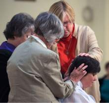 Fifty men and women, many of them in Salt Lake City for the Parliament of the World's Religions, joined in the ordination, taking turns touching Carbone's head and arms as they prayed silently over her.