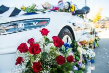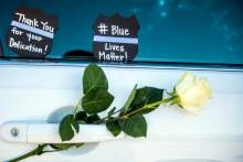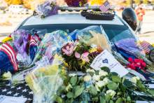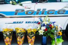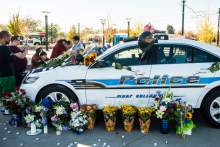 Brotherson's patrol car adorned with a blue sash, the fallen officer's photo, and hundreds of notes and flowers was parked at Fairbourne Station Plaza near City Hall during the vigil.