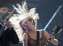 Swift kicked off the concert with her popular "Sparks Fly" and quickly followed with "Mine" and "The Story of Us," all the while strumming the guitar and flipping her blond locks up and down and side to side.