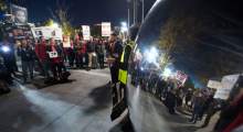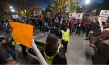 As police ordered them off the street, some protesters complied while others shouted expletives in reply. A small group broke away and walked to State Street, where they stood on the roadway in front of Matheson Courthouse.