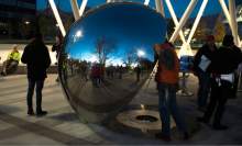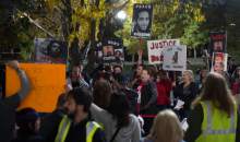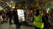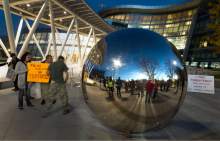 The crowd rallied as the sun set on the Public Safety Building, chanting at the new, $125 million structure: "Not a penny, not a dollar! We won't pay for police to slaughter!"