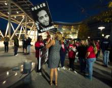 About 120 people gathered downtown, joining rallies in several other cities during Wednesday's National Day of Protest Against Police Brutality. Families and friends held signs in memory of several people gunned down in recent years by police: