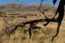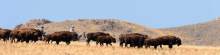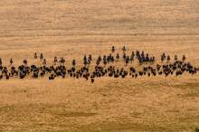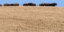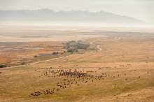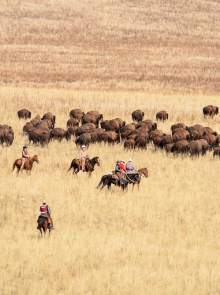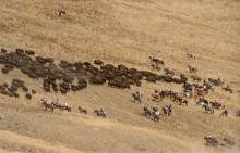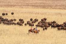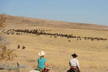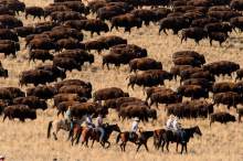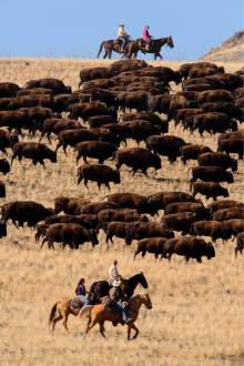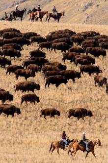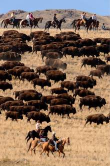 Riders drive bison during the annual bison roundup at Antelope Island State Park, Friday October 24, 2014.