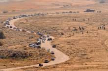 Onlookers line the road during the annual bison roundup at Antelope Island State Park, Friday October 24, 2014.