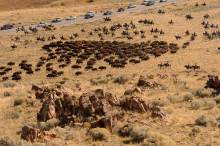 Onlookers line the road during the annual bison roundup at Antelope Island State Park, Frid