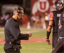 Utah head coach Kyle Whittingham gets the Utes fired up in the final seconds of the game in the Utes' 24-21 victory over the USC Trojans at Rice-Eccles Stadium, Saturday, October 25, 2014.