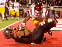 USC Trojans safety Elijah Steen (24) jumps on Ute wide receiver Kaelin Clay (8) as he holds