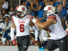 Utah Utes offensive lineman Siaosi Aiono (60) congratulates Utah Ute's wide receiver Dres Anderson (6) after his touchdown, giving the Ute's a two touchdown lead over UCLA, at the Rose Bowl in Pasadena, Saturday, October 4, 2014
