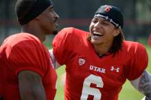 Wide receivers Kenneth Scott, left, and Dres Anderson joke with one another during an interview following the Utes first full contact practice with all pads.