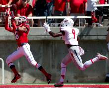 Wide receivers Kenneth Scott, left, and Dres Anderson joke with one another during an
