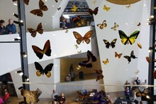 The Collections Wall, which portrays the range of the building's contents across time, disciplines and regions, exemplifies the museum's effort to simultaneously evoke emotion and support science, according to museum associate director Ann Hanniball. An undulating line of colorful butterflies meanders upward through dinosaur bones, a petrified stump, Ancestral Puebloan pottery and elaborately beaded native Utahn attire. The specimens appear to float because their mounts are largely invisible.