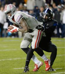 The Cougars finished with 267 rushing yards after getting just 28 net yards on the ground in the first quarter - and 30 of that came when receiver Jordan Leslie took a lateral and streaked down the East sideline for BYU's first touchdown.