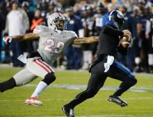 Brigham Young Cougars quarterback Christian Stewart (7) escapes the grasp of UNLV Rebels