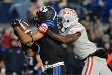 Brigham Young Cougars wide receiver Jordan Leslie (9) hauls in a pass in front of UNLV Re