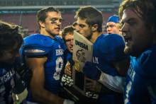 Bingham's Colton Livingston (5) Chayden Johnston (12) and Charlie Baggett IV (55) celebrate after winning the 5A state championship game at Rice-Eccles Stadium Friday November 21, 2014. Bingham defeated American Fork 20-3.