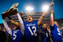 Bingham's Kade Cloward (2) celebrates after winning the 5A state championship game at Rice-Eccles Stadium Friday November 21, 2014. Bingham defeated American Fork 20-3.