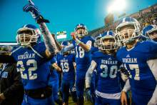 Members of the Bingham football team celebrate after winning the 5A state championship gam