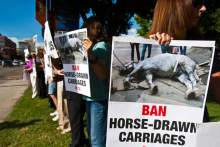 PETA, the Utah Animal Rights Coalition and dozens of unaffiliated residents called for a ban on horse-drawn carriages downtown at an August 2013 rally outside City Hall. The Humane Society of Utah also called for an end to the tradition.