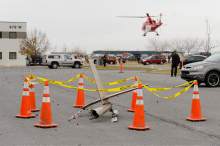 The helicopter crashed about 2,000 feet from the end of the runway at Sky Park Airport in Bountiful. Witnesses told NTSB authorities that they heard "popping sounds" and then saw the main rotor and the empennage or tail assembly separate from the helicopter.