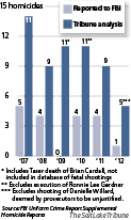 From 2007 to 2012, the most recent year for which full FBI stats are available, Utah police agencies reported 18 justifiable homicides by law enforcement. However, The Salt Lake Tribune has identified 59 homicides by law enforcement officers, deemed justified by prosecutors, during that time period. A Tribune review from 2010 through 2014 showed police use of force is the second leading contributor to the state's homicide tally, topped only by domestic violence.