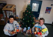 Stephanie Pappas, left, and Holly Henri of Roofers Supply model the hoodies that are given to people who donate food or clothing items for their Holiday charitable drive. They stand holding some of the donated items near the Christmas tree where the donations are kept, Thursday December 5, 2013.