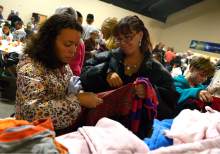 l-r Jessica Aponte and Toni Webb check clothing sizes while looking for clothes for themselves and their daughters after their midday Thanksgiving dinner. The Salt Lake City Mission provided Thanksgiving meals at the Christian Life Center, Thursday, November 27, 2014 in Salt Lake City.